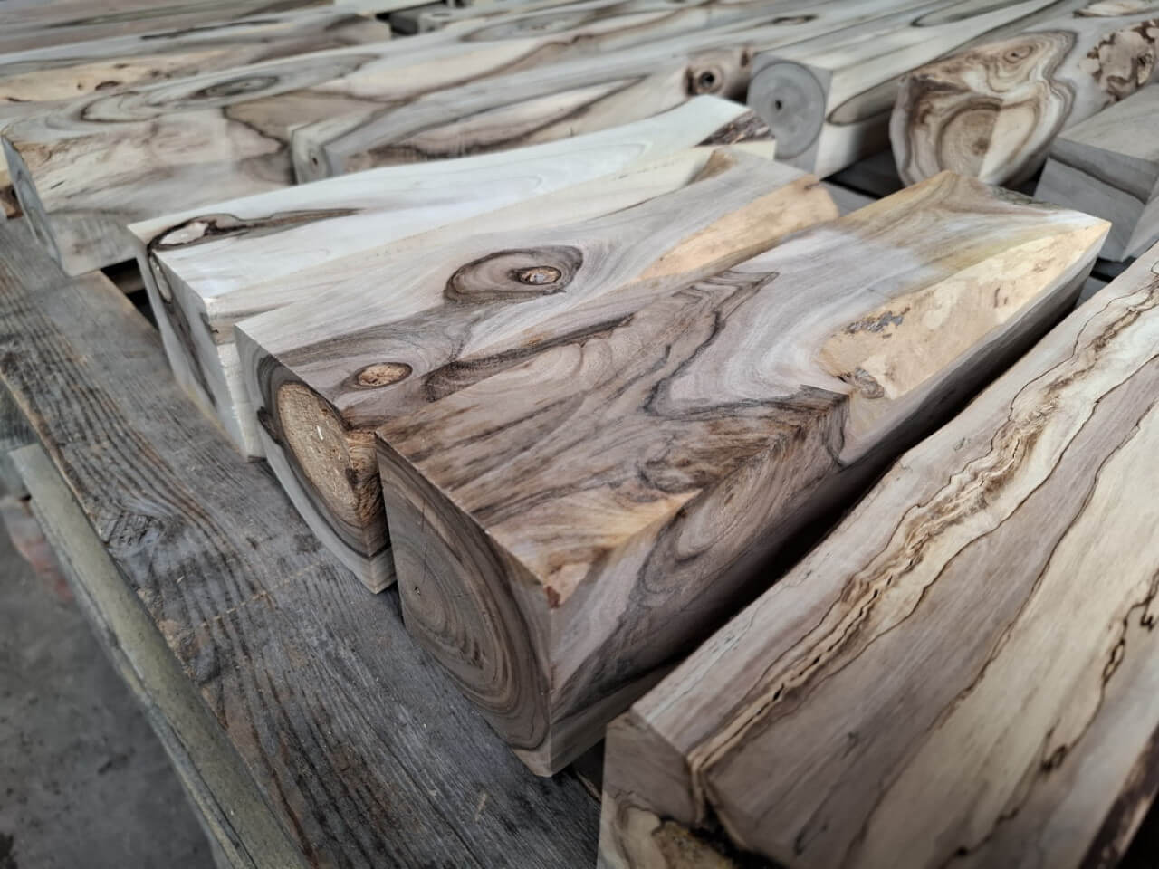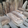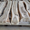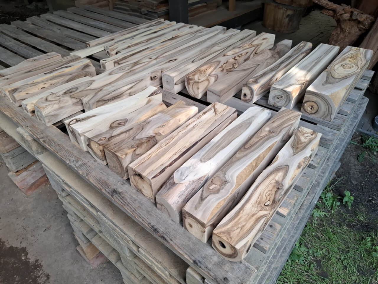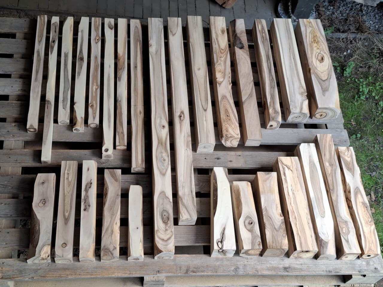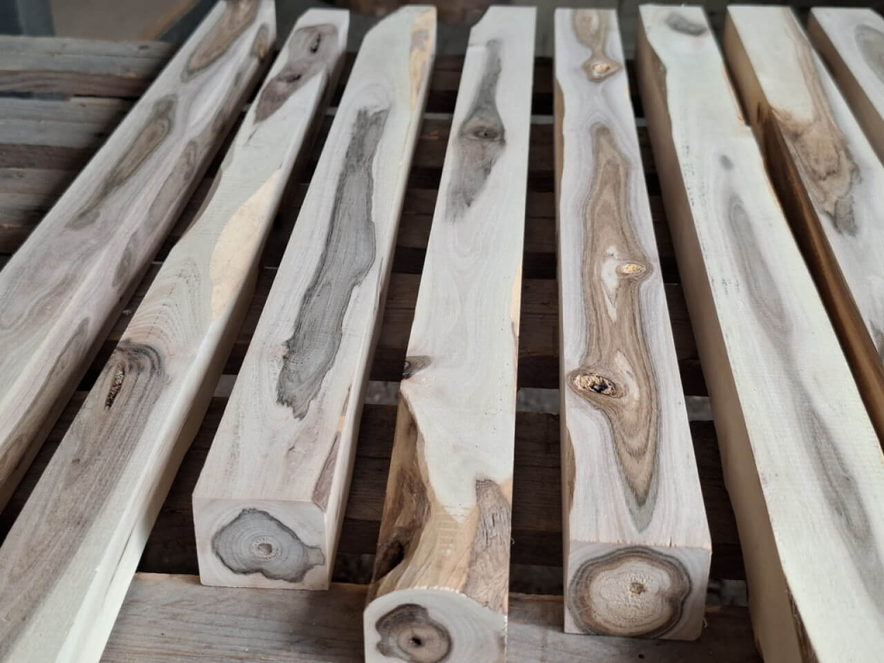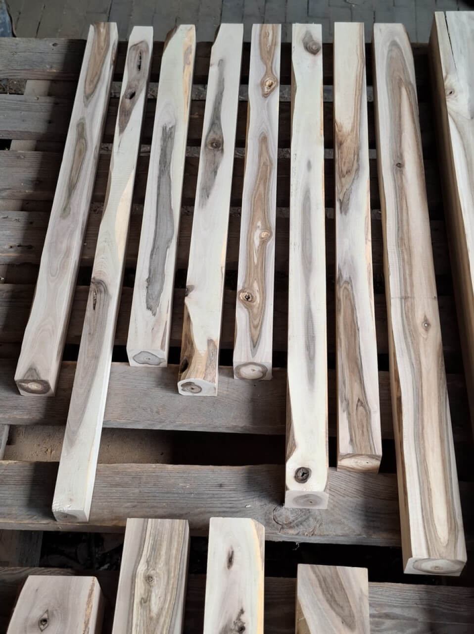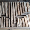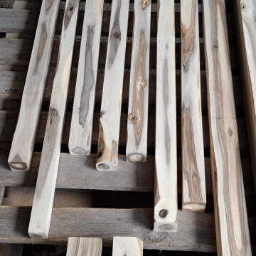 Kantówki/Belki czterostronnie strugane, docięte na równo, wykonane z gałęzi i pni niedużych rozmiarów, z wadami, sękami i częściowo naturalną krawędzią. Większość poniżej 75cm długości, dwie sztuki tylko dłuższe, przekroje różne, między 3-8cm, nie wszystkie kwadratowe.