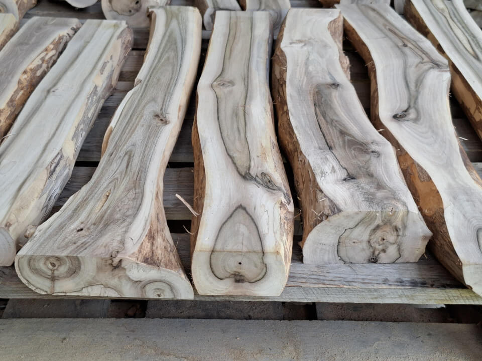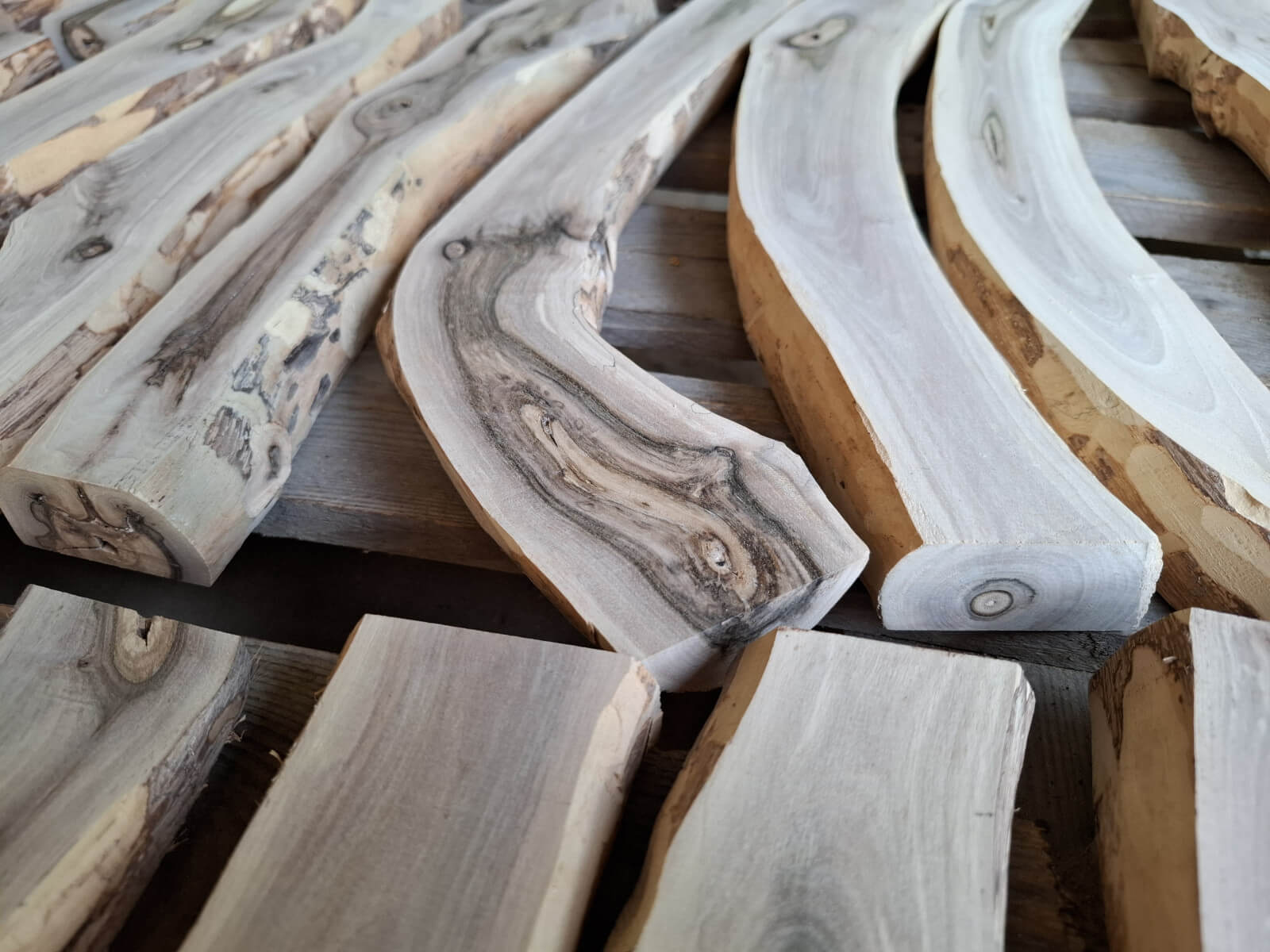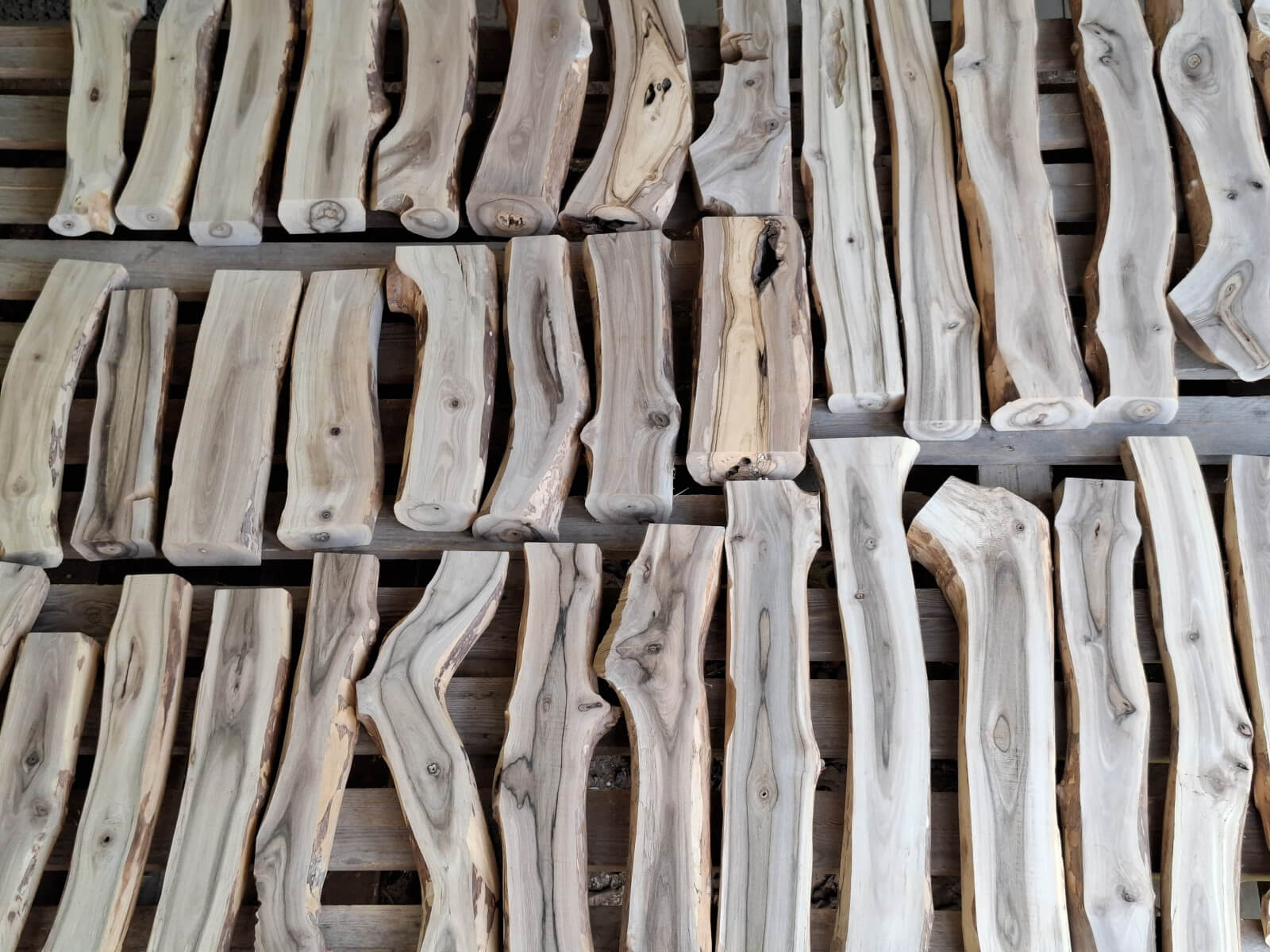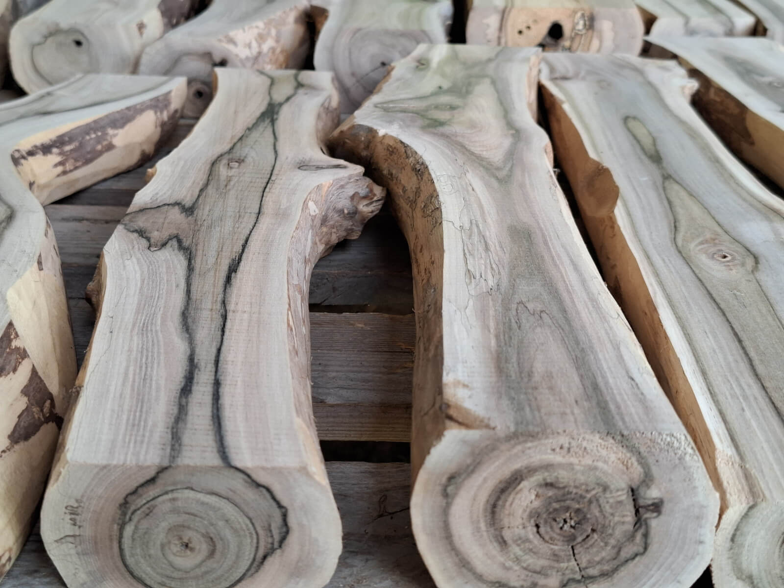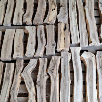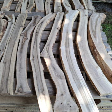 Fragmenty gałęzi z orzecha włoskiego dwustronnie obrzynane, suche, strugane i docięte na równo, rustykalne z wadami i sękami. Różne grubości, długości, szerokości i kształty. Wymagają niewielkiej ilości pracy by zrobić z nich dekorację, wieszak albo półprodukty do różnych konstrukcji szkieletowych, jak ramki, krzesła, fotele.