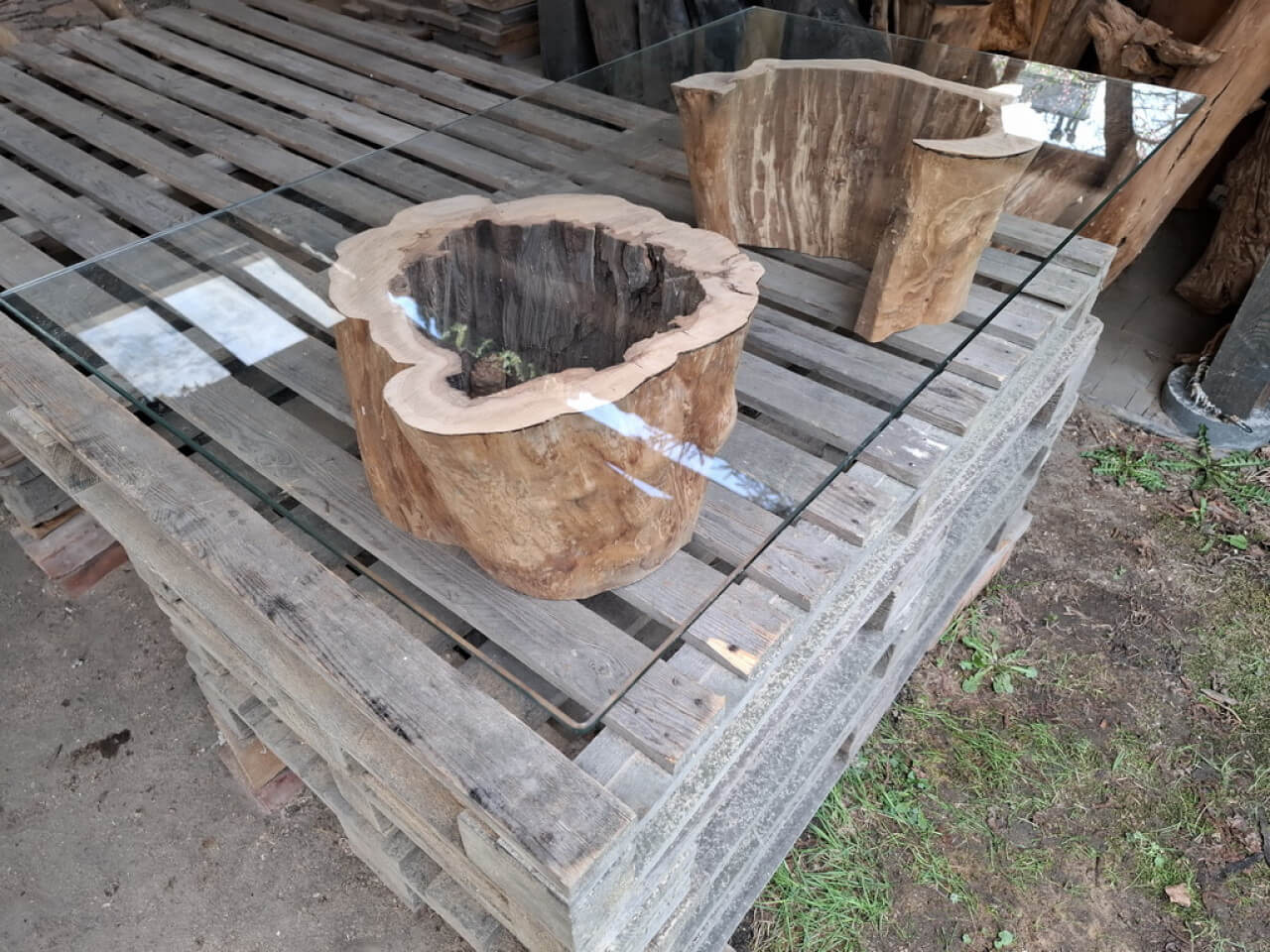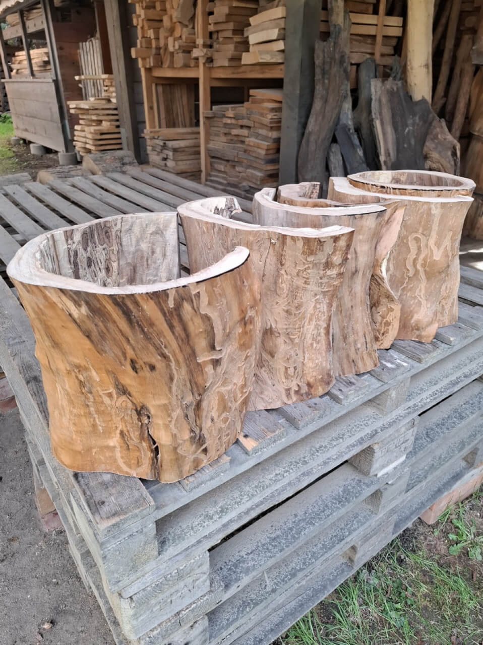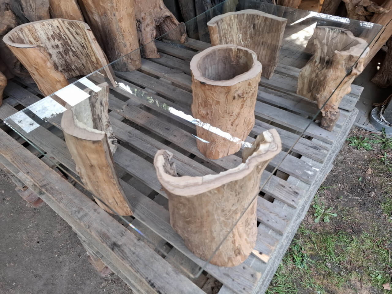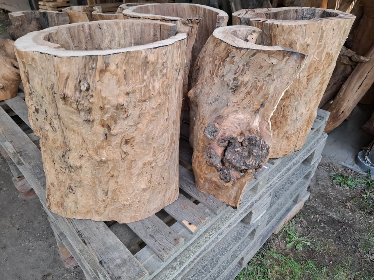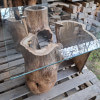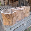 Propozycja podstawy ławy, ławki, taboretu, doniczki, lampek stojących, itd z pustych pni jabłoni i ich fragmentów. Pieńki są suche, okorowane, od środka dłutowane ręcznie, przycięte na dokładne wymiary, tak że od góry są wypoziomowane, wymagają jeszcze obróbki wykańczającej szczotkowaniem i szlifowania powierzchni czołowych. Mogą być np. podstawą ławy ze szklanym blatem, doniczką, lampką stojącą lub kinkietem ściennym. W tym stadium obróbki, ceny od 150zł za mniejsze fragmenty do 700-800zł za większe pełne pnie, oczywiście jest możliwość przycięcia na inny wymiar i dokładnego wykończenia. najchętniej sprzedałbym całość na palecie, albo komplet z danego wymiaru, ale pojedyncze sztuki wysyłkowo też jak najbardziej. W sumie jest 23 szt. różnych wysokości.