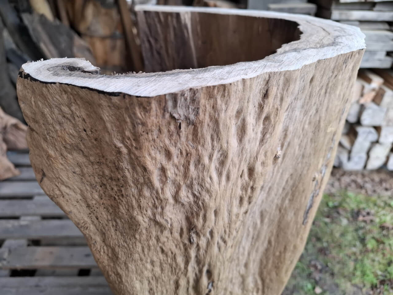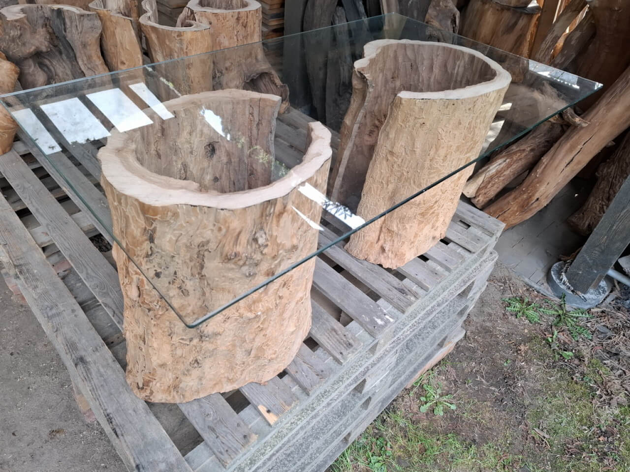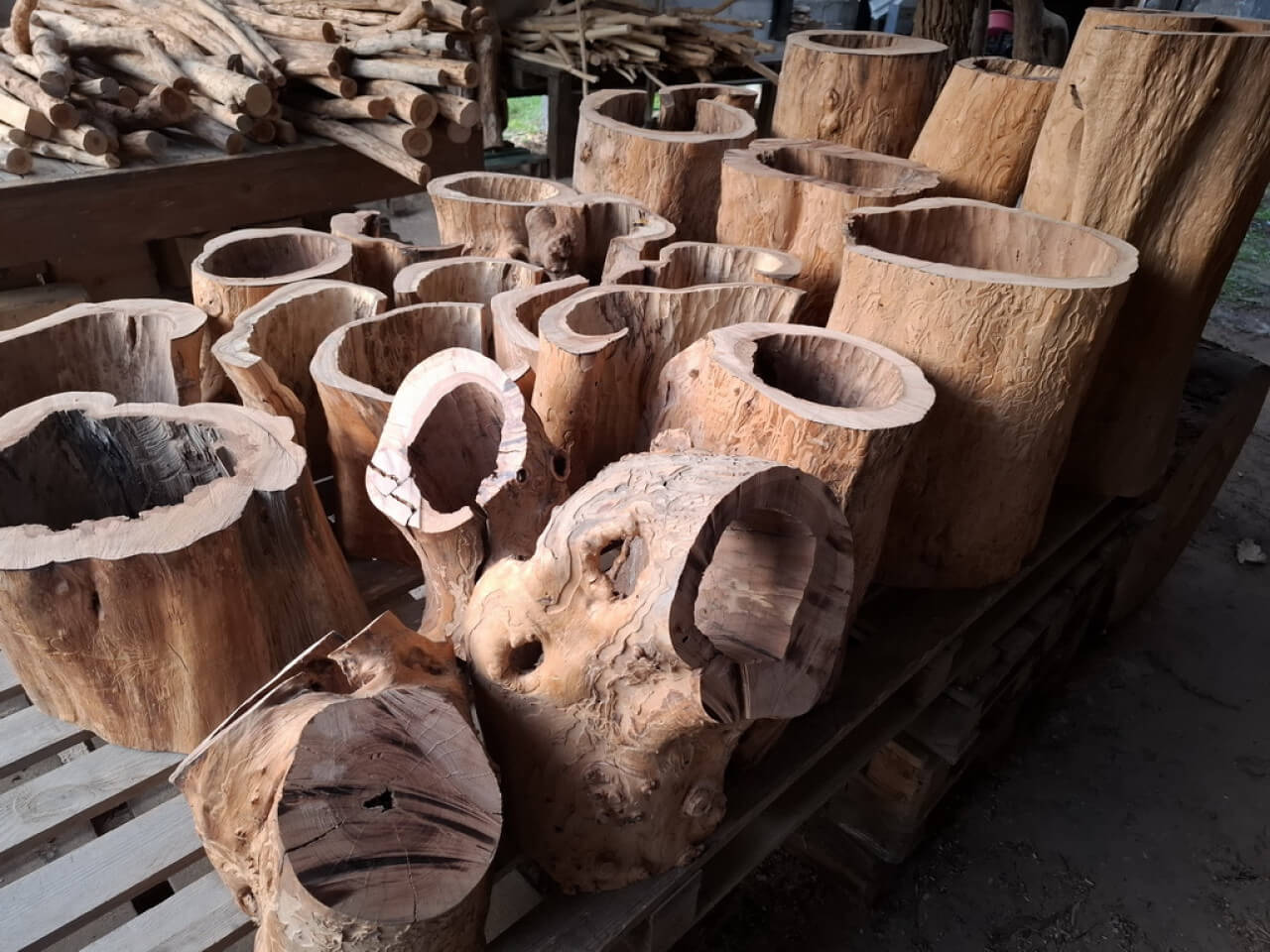 Propozycja podstawy ławy, ławki, taboretu, doniczki, lampek stojących, itd z pustych pni jabłoni i ich fragmentów. Pieńki są suche, okorowane, od środka dłutowane ręcznie, przycięte na dokładne wymiary, tak że od góry są wypoziomowane, wymagają jeszcze obróbki wykańczającej szczotkowaniem i szlifowania powierzchni czołowych. Mogą być np. podstawą ławy ze szklanym blatem, doniczką, lampką stojącą lub kinkietem ściennym. W tym stadium obróbki, ceny od 150zł za mniejsze fragmenty do 700-800zł za większe pełne pnie, oczywiście jest możliwość przycięcia na inny wymiar i dokładnego wykończenia. najchętniej sprzedałbym całość na palecie, albo komplet z danego wymiaru, ale pojedyncze sztuki wysyłkowo też jak najbardziej. W sumie jest 23 szt. różnych wysokości.