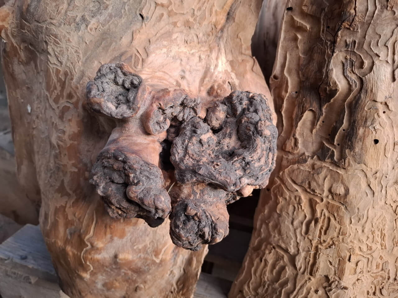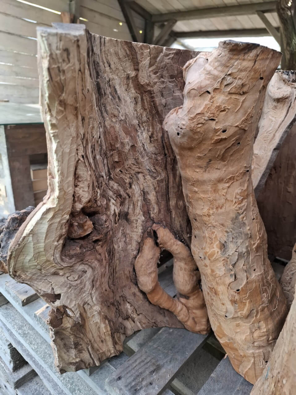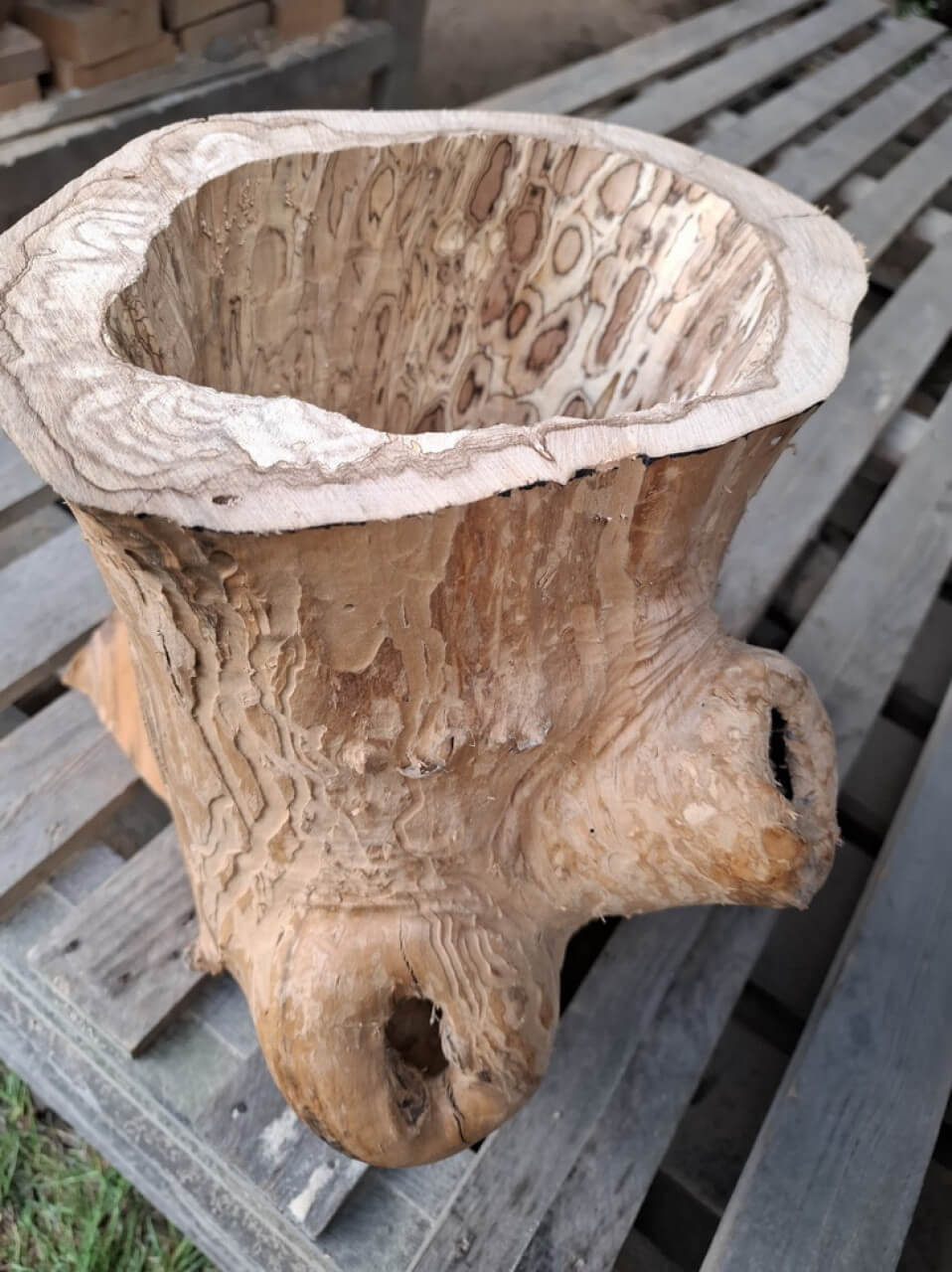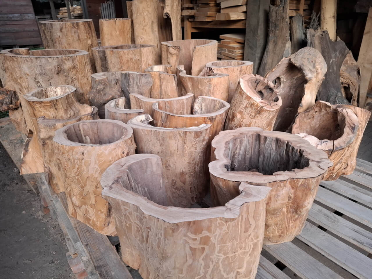 Propozycja podstawy ławy, ławki, taboretu, doniczki, lampek stojących, itd z pustych pni jabłoni i ich fragmentów. Pieńki są suche, okorowane, od środka dłutowane ręcznie, przycięte na dokładne wymiary, tak że od góry są wypoziomowane, wymagają jeszcze obróbki wykańczającej szczotkowaniem i szlifowania powierzchni czołowych. Mogą być np. podstawą ławy ze szklanym blatem, doniczką, lampką stojącą lub kinkietem ściennym. W tym stadium obróbki, ceny od 150zł za mniejsze fragmenty do 700-800zł za większe pełne pnie, oczywiście jest możliwość przycięcia na inny wymiar i dokładnego wykończenia. najchętniej sprzedałbym całość na palecie, albo komplet z danego wymiaru, ale pojedyncze sztuki wysyłkowo też jak najbardziej. W sumie jest 23 szt. różnych wysokości.